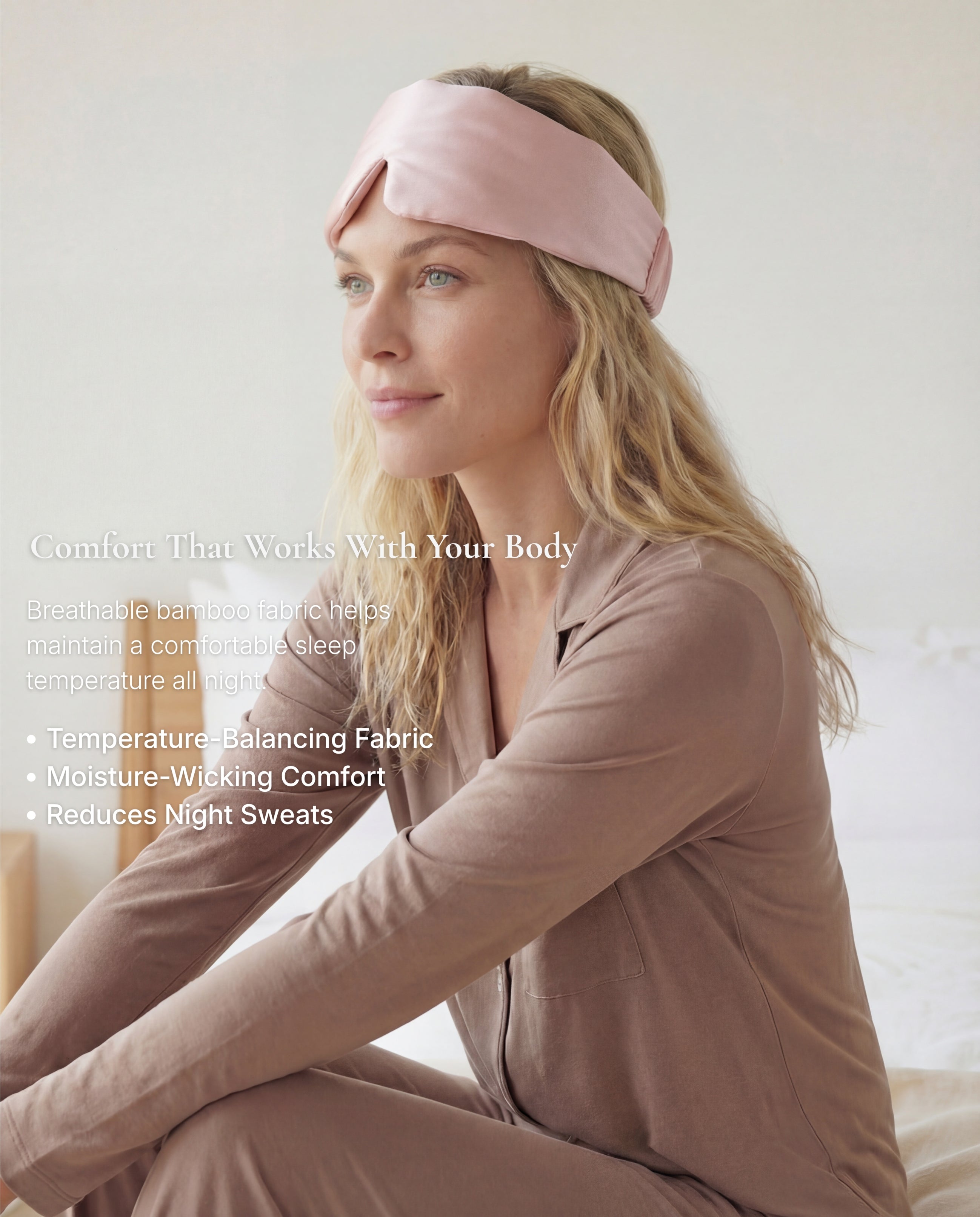 Struggling with overheating at night? Our bamboo sleepwear naturally regulates temperature so you stay comfortable all night. No more waking up drenched or throwing off covers.